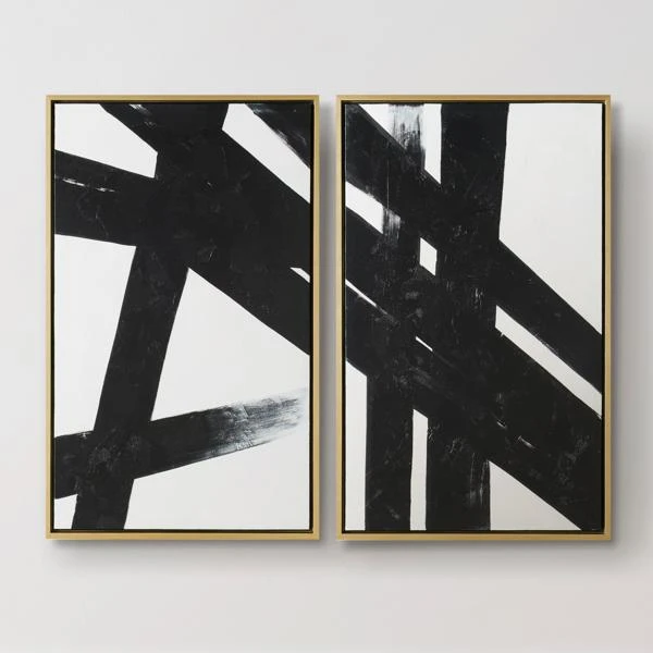 Bold brushstrokes in black add an incredible element of texture to this original diptych from artist BJ Synn. Hand-painted on canvas, each piece is displayed in a gold floater frame.