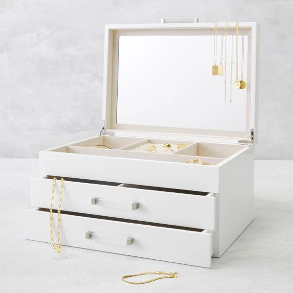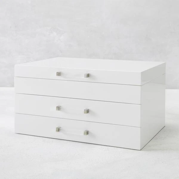 A jewelry box for serious collectors, our largest has two drawers for bracelets and pendants. A top tray features compartments for immediate needs. Clear acrylic handles add a touch of chic style.