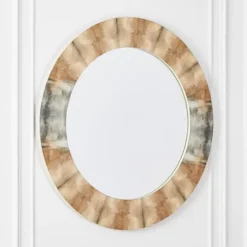 Inspired by cloudscape paintings, this mirrorās round frame is finished with a soft wash of color in gradients of taupe and blue, making it a brilliant, neutral accent for any wall.