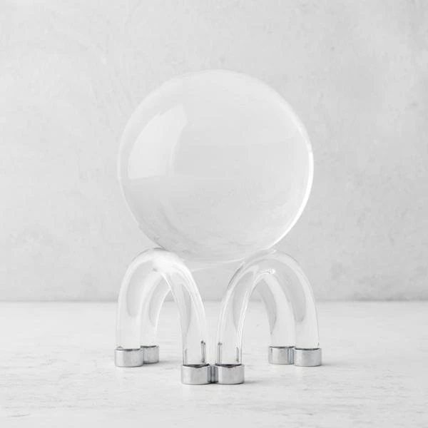 Set of an ultramodern arched base, this crystal orb adds a sleek, sculptural element to any shelf or mantel.