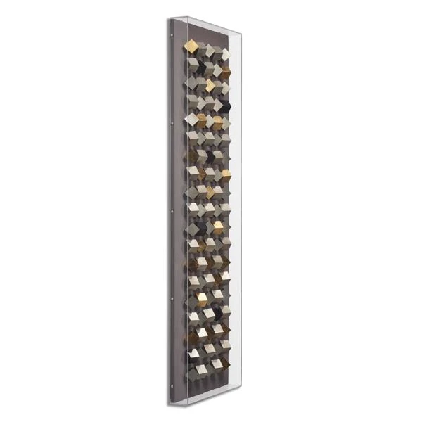 It’s your one way ticket to midnight…call it heavy metal!” Set in a shadowbox frame, this work makes an immediate impact on the wall with its cubic, dimensional design and tri-tone metallic finish.