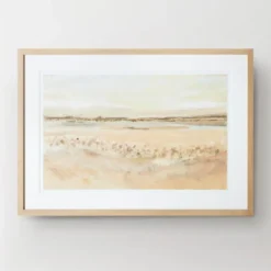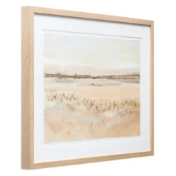 - Set under glass with a white mat and solid wood frame with a natural finish