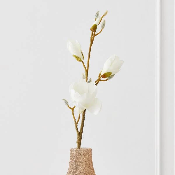 Faux white magnolia blossoms look entirely lifelike with textured natural stems. Zero maintenance required.