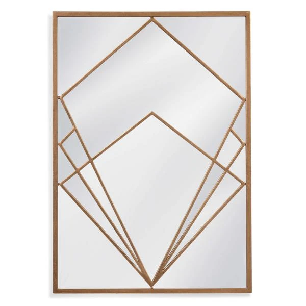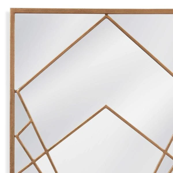 Our Finn Mirror features a thin metal frame finished in gold with gold triangular overlay design.