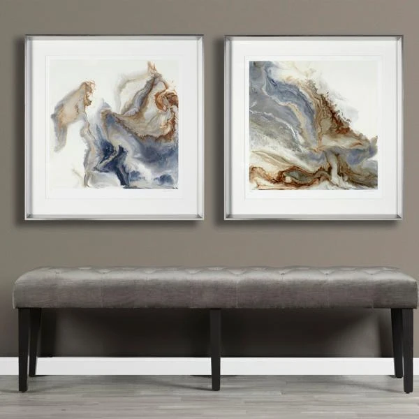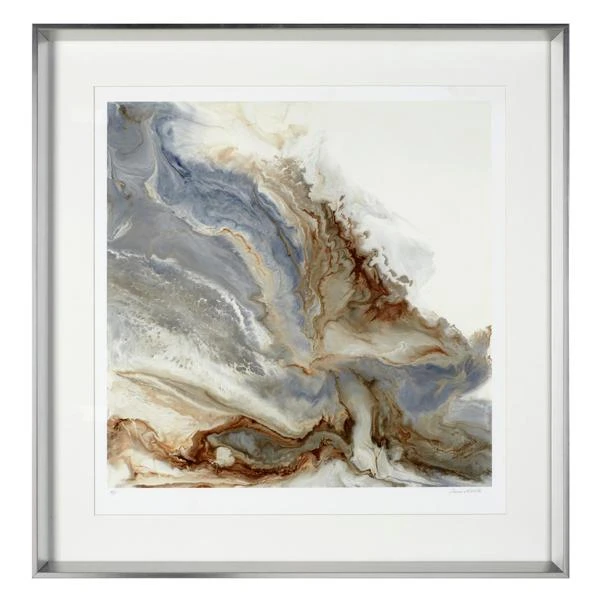 - Print framed in a slant profile silver finish moulding with a white mat.