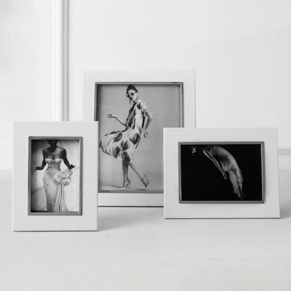 A stylish way to display a favorite snap, this picture frame enjoys a mix of textures with a white faux-shagreen finish and sleek silver border.