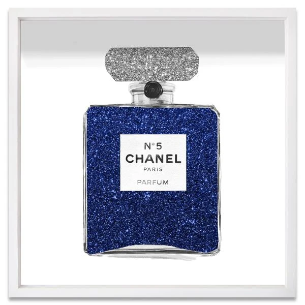 Featuring hand-applied glitter embellishments, this image of Chanel No. 5 adds a stylish, glam note to the wall. Printed on paper, this piece is displayed in a white shadowbox frame.