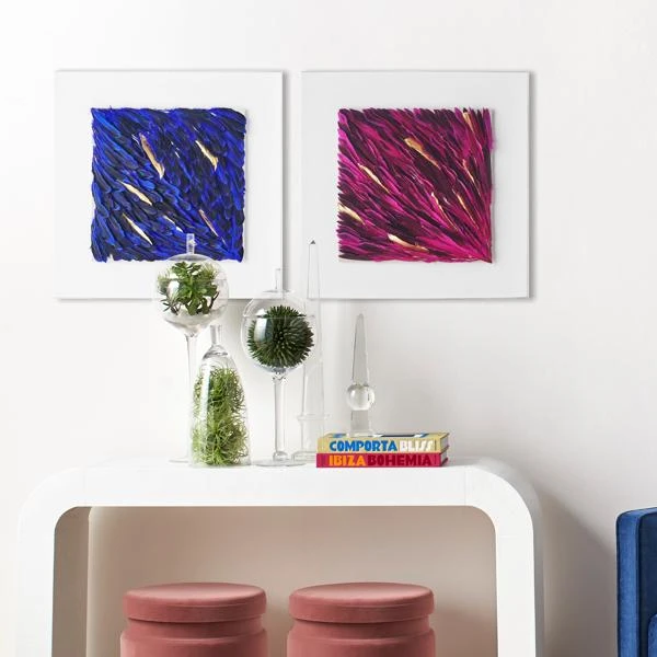 Perfect for adding texture and color to your wall, this artful arrangement of fuchsia-dyed feathers is embellished with gold accents and displayed in a shadowbox frame.