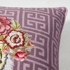An embroidered tiger with a lush floral headdress pops against a Greek-key ground in this striking pillow. Solid back.