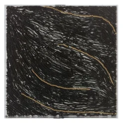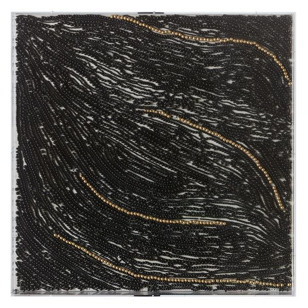 Perfect for adding texture, drama, and shine to your wall, this captivating composition features strands of black and gold beads displayed in a clear acrylic shadowbox frame.