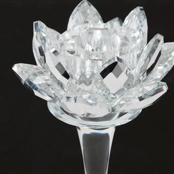 Give your evening a glam glow. This taper candle holder features an intricately faceted glass lotus at its base for eye-catching candlelight that dances the night away. Sold separately.