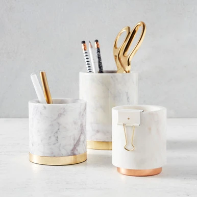 Crafted of marble with a brass-banded base, this pen holder is a chic upgrade for the desk or home office.