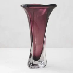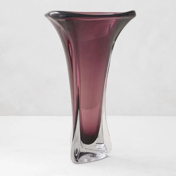 Easily a statement piece, our hand-blown Maydan Vase is distinct in color and design. With a fluted trumpet shape that opens to a graceful waving lip, Maydanās captivating Aubergine palette is a deeply beautiful contrast to its crystal clear base.