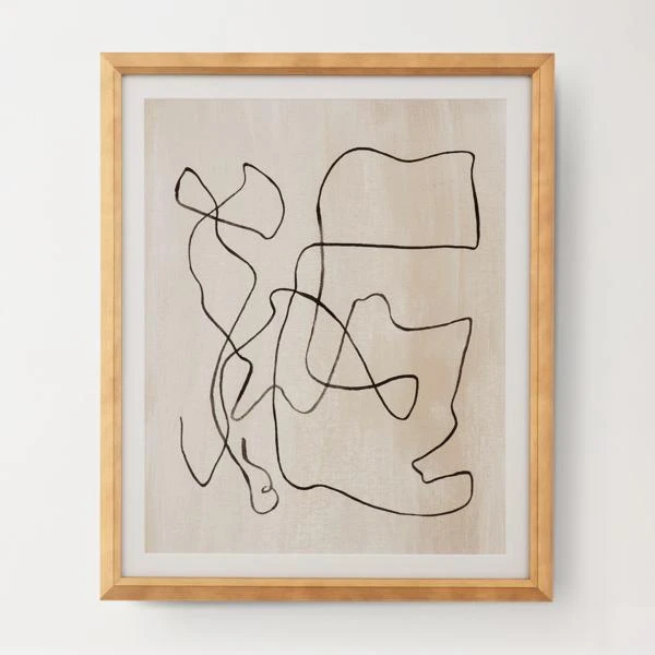 Our Maze art series features abstract ink scribbles on a cream background with white border and a simple natural wood frame.Ā