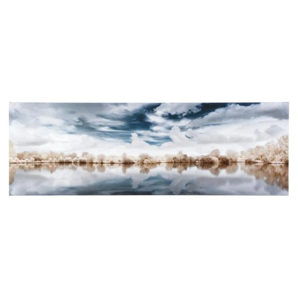 Grandiose in size, the tranquil setting of a lake reflecting its surroundings of tonal hued trees and a cloud covered sky, offer viewers a slice of serenity in our piece titled Mirrored.  Layered with depth and tone on tone hues of blues juxtaposed against creams and whites, Mirrored brings a sense of calmness to a space.  Gallery wrapped for modern appeal, Mirrored makes the perfect complement to a wider variety of décor settings.