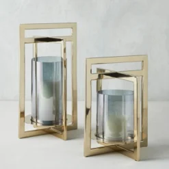 A sleek and modern addition to any space. This gleaming gold lantern features a silvered glass vessel, encased in an interlocking framework.