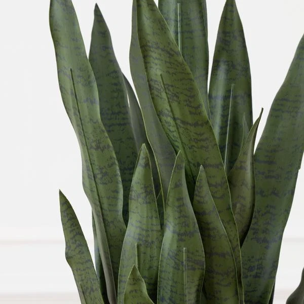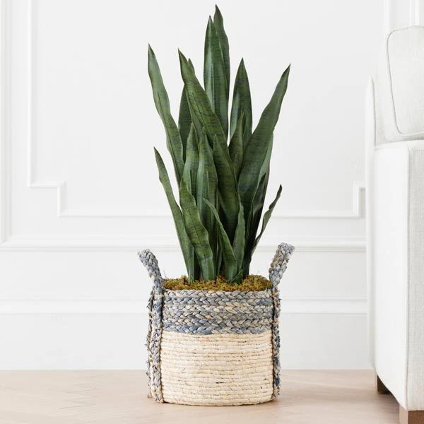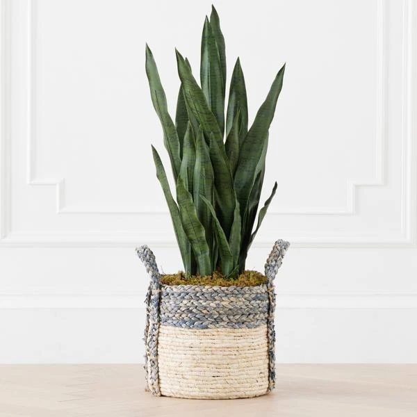 A visually stunningĀ and stately faux arrangement featuring Mother in Law’s Tongue in a woven blue and tan basket.Ā