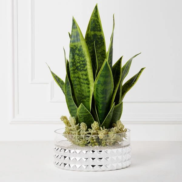 This premade faux floral arrangement features lush green Mother’s Tongue leaves intertwined with mini flocked succulents, all artfully arranged in a glass bowl adorned with a silver studded border, adding natural beauty with a hint of edginess.