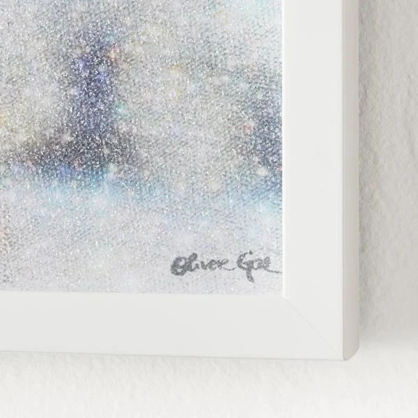 - Glossy art print crystalized with a fine diamond dust finish, mounted within a high gloss white wood shadowbox frame, and set under plexiglass.