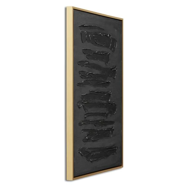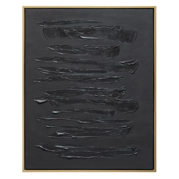 Bold brushstrokes in a moody, dark palette add an incredible element of texture and drama to this abstraction. Painted on canvas, this piece is displayed in a gold floater frame.