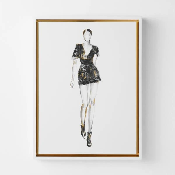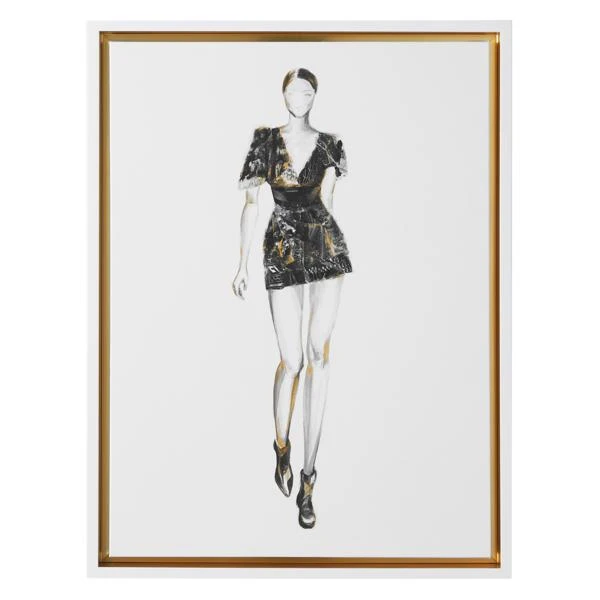 Small-scale in stature, but big on style, the On The Runway Series makes a fashion statement for sure. Each piece is created using giclee on canvas with a hand-applied image brush gel finish. They are framed in white floater frames with gold inner framing. On The Runway XI is #2 of 4 in a series.Ā