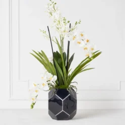 This elegant faux floral centerpiece features cream Vanda and Dendrobium orchids artfully arranged in a sleek black glass bowl, bringing a touch of sophistication and natural beauty to any space. The lifelike blooms and the contrasting vessel create a captivating display that will endure without the need for watering or maintenance.