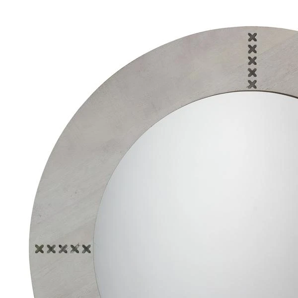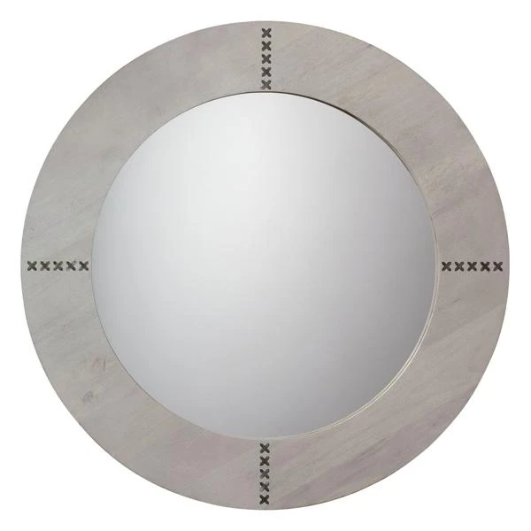 Simple yet impactful, this mirrorās round frame is crafted of grey-washed wood and inlaid with antiqued silver crosshatch accents.