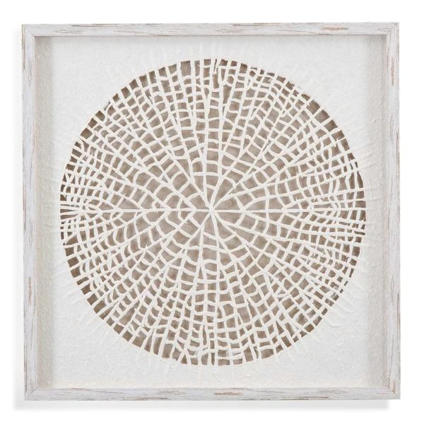 Our Portola Wall Decor is a shadow box accentuated with a light tan silk-like mat and a spiral woven design of white rice paper with a white washed molding. This piece of artĀ is hand painted by a skilled artist lending itself to a unique technique and will vary slightly.Ā