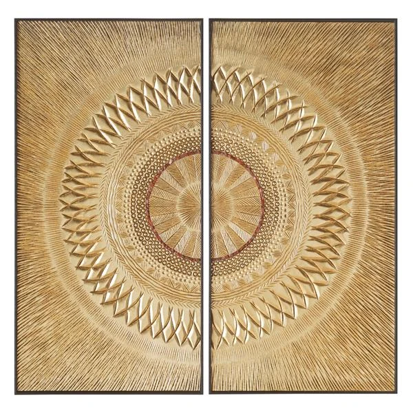 Reminiscent of the sun, this diptych enlivens any wall with its dimensional design and striking gold finish.