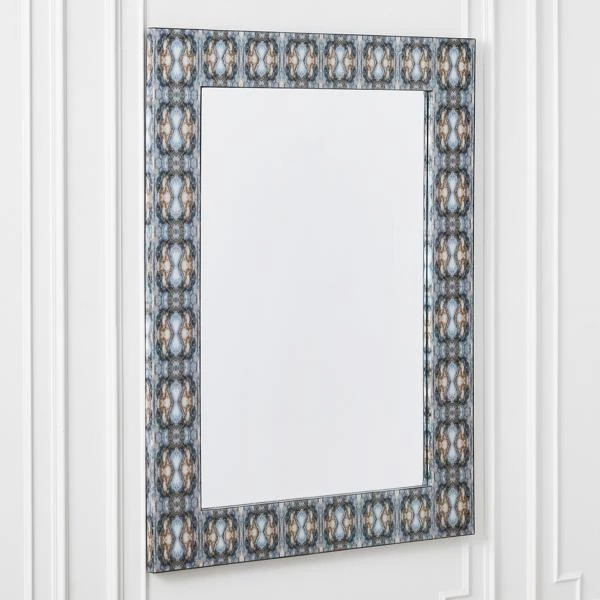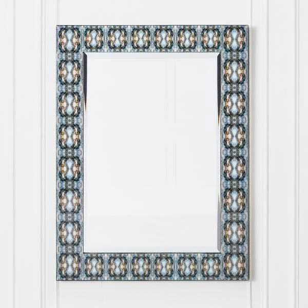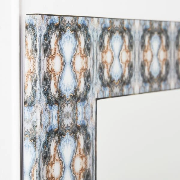 Sure to be a focal point in any room, this mirrorās frame features an eye-catching pattern inspired by Rorschach inkblots in indigo blue with silver and gold leaf embellishments.
