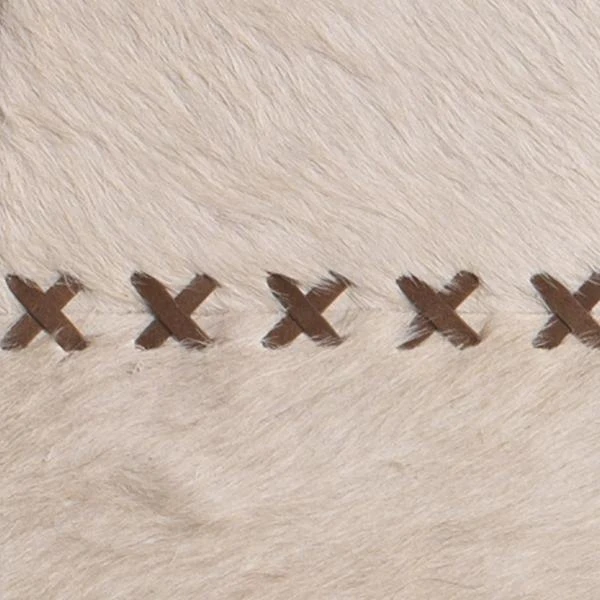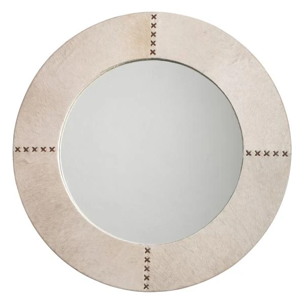 Simple yet impactful, this mirrorās round frame is covered in luxe off-white hair-on hide with brown leather whip-stitched accents.