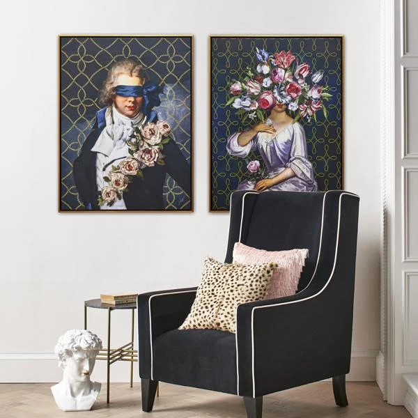 Partially obscured by a blindfold and lush flowers, this portrait from artist Jackie Von Tobel adds a whimsical note to any wall. Printed on canvas with an image brush gel finish for added texture, this piece is displayed in a gold floater frame.