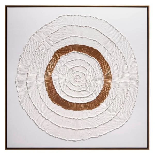 Bold brushstrokes in bright white and gold add an incredible element of texture to this original work by artist Beverly Fuller. Painted on canvas, this piece is displayed in a floater frame.Ā