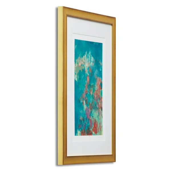 This beautifully layered, limited-edition abstraction from artist Jennifer Goldberger showcases expressive brushstrokes and brilliant pops of color. Printed on archival paper, this piece is matted and displayed under glass in an antiqued gold frame.