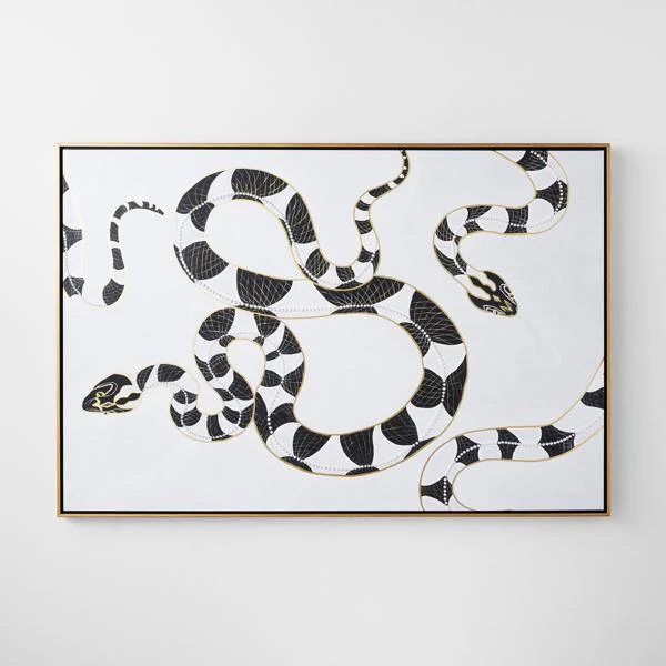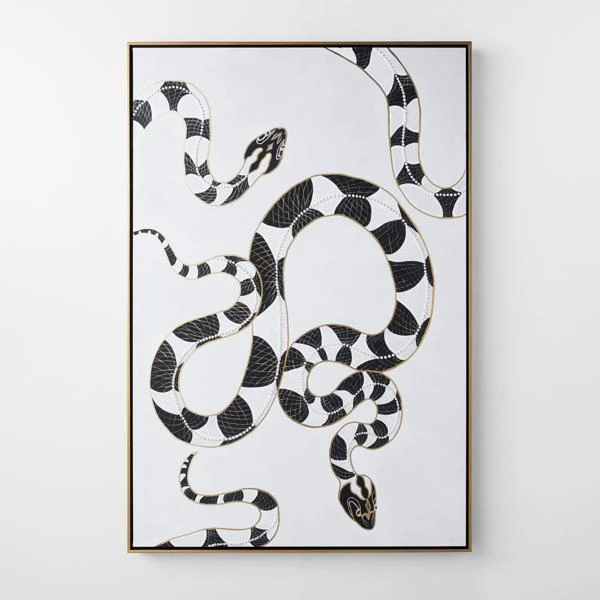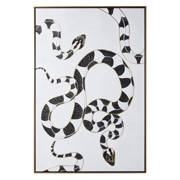 Like Eve, you’ll be tempted by the serpent in this painting. The monochromatic image is easily incorporated into your decor, and it makes a stunning visual statement. This piece is created by printing the image on canvas with “diamond dust” glitter and hand-embellishing texture on it. Finished with an image brush gel, this piece is set in a gold floater frame.Ā