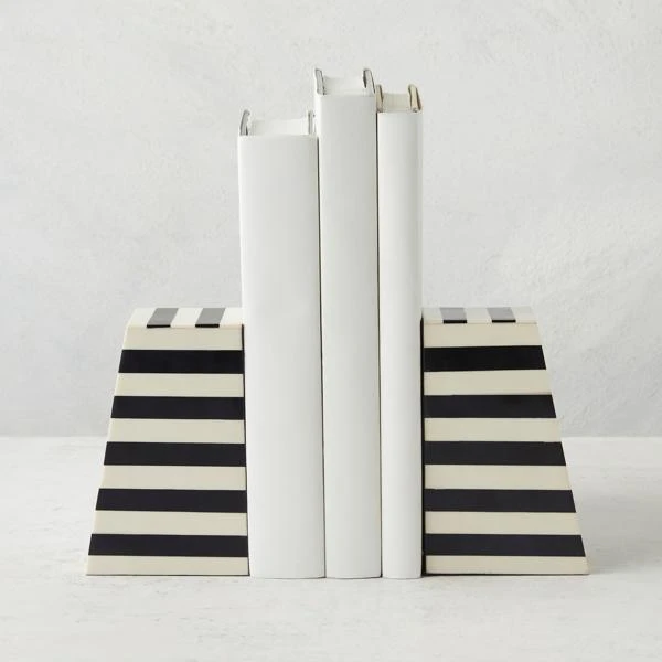 Overlaid with a mosaic design of black and white resin tiles, these trapezoidal bookends make a statement on any shelf.