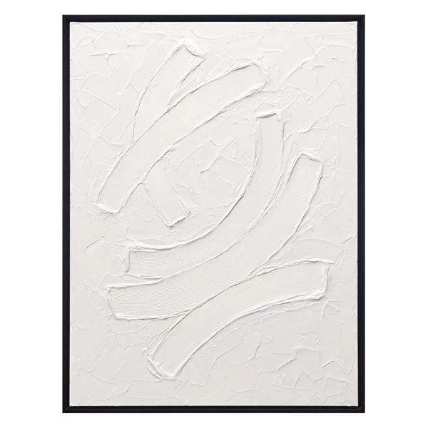 Bold brushstrokes in bright white add an incredible element of texture to this original work by artist Beverly Fuller. Painted on canvas, this piece is displayed in a black floater frame.
